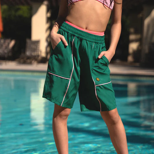 The big, slouchy, hip-hop, ready-to-go short. Elastic waist, interior d-cord at waist and deep pockets. Fold over the waist for a more authentic lower rise short. Lightweight stretch woven fabric