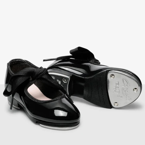 CAPEZIO tap shoe for beginners! The Shuffle Tap comes in shiny black patent leather, caramel leather or white leather. Adorable ribbon tie and double snap, fastening elastic will ensure the most secure fit. Features signature, Capezio Tele-Tone® toe and heel taps mounted on fiberboard for flawless sound. Introductory tappers will take their first steps with confidence in the Shuffle Tap.